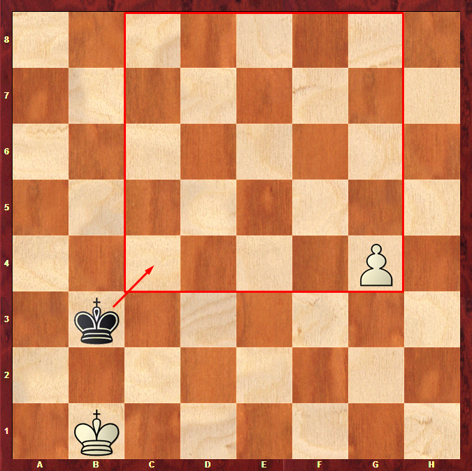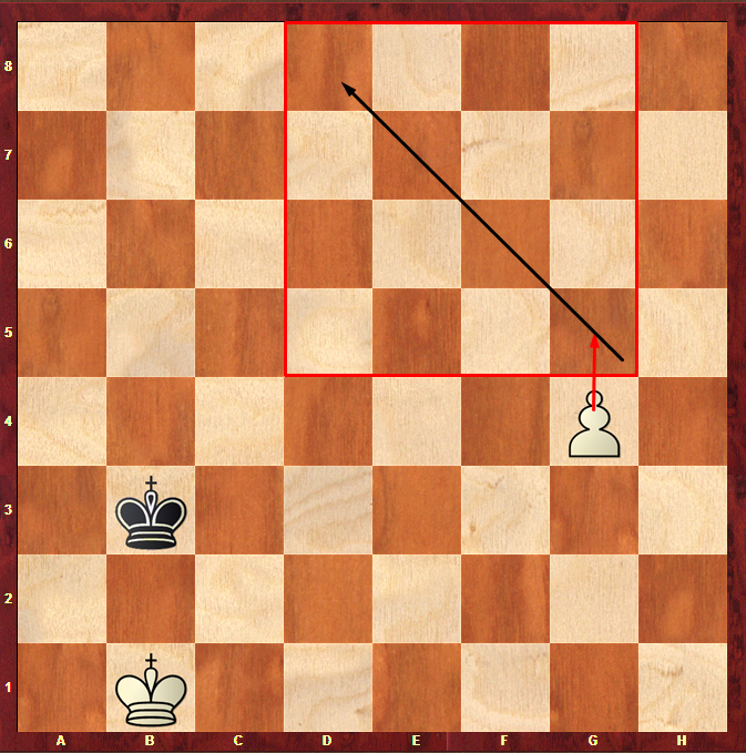 En su turno las negras jugarán 1....-Rc4, y entran en el cuadrado del peón que está situado en g4. Su lado es igual a la distancia entre el peón y su casilla de coronación, es decir, al cuadrado generado por las casillas g4-g8-c8-c4, tal y como podemos ver en la figura 1.
