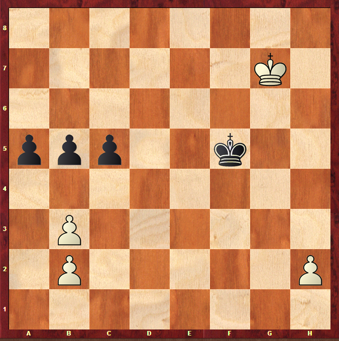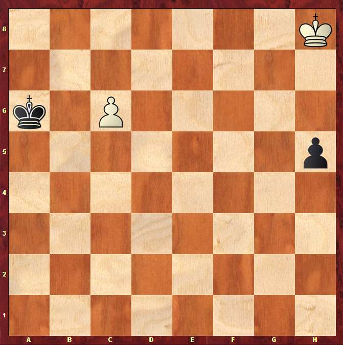 A primera vista parece IMPOSIBLE parar el peón negro que se encuentra en h5 alejado del rey blanco, pues éste está en h8. Sin embargo, utilizando la doble amenaza - (1) conversión del peón blanco en dama y (2) la entrada en el cuadrado de coronación del peón negro - las blancas lograrán salvar la partida.