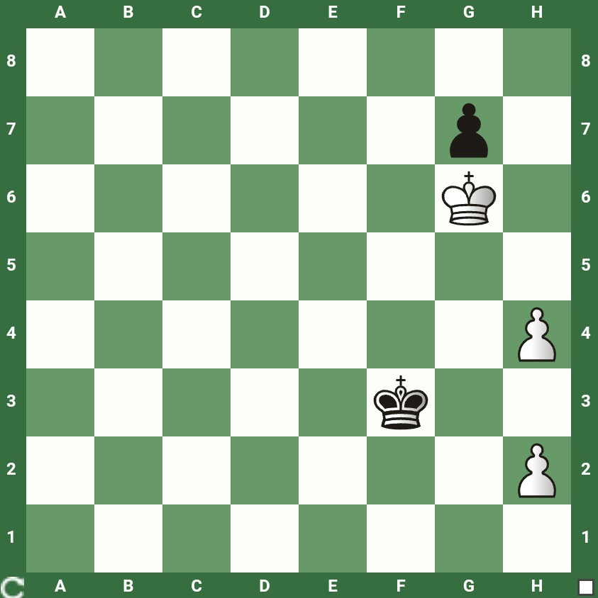 De esta forma 2...-Rc2 3.Re3!-Rd1 4.g4, el blanco debe aprovechar y avanzar el peón, pues el rey negro está cortado. Sigue 4...-Re1 5.g5-Rf1 6.Rf3!, así se culmina la maniobra, no hay que dejar que el negro progrese aún.