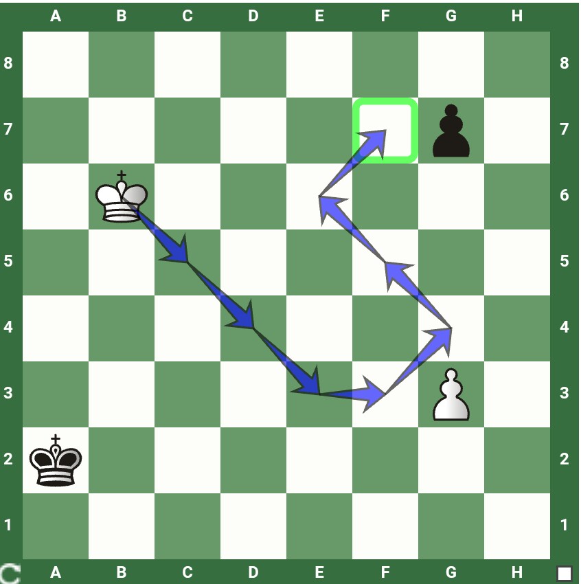 Analizando la anterior posición (fig. 1) podemos observar que las blancas necesitan realizar 5 jugadas para ganar el peón de a7. Si tomamos el camino rápido, el rey blanco capturará el peón usando las casillas e7-d7-c7-b7-a7. Sin embargo, es ese mismo tiempo, el rey negro, cuando el blanco capture en a7, entrará en la casilla c7 y hará tablas teóricas.