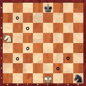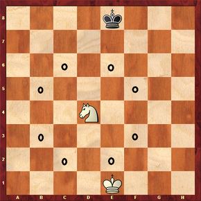 Naturalmente, en esta misma posición, también puede ser jugado a cualquiera de las casillas señaladas con una "o". Cabe señalar que si en el anterior diagrama le hubiese tocado jugar al bando negro, el caballo blanco podría haber sido capturado tanto por el caballo negro como por el peón de la casilla f6.