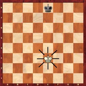 El REY tiene el mismo movimiento que la DAMA, es decir, horizontal, vertical y diagonal. Pero existe una importante diferenca: sólo puede ser jugado una casilla en todas las direcciones. Para explicarlo gráficamente, ver la siguiente figura.